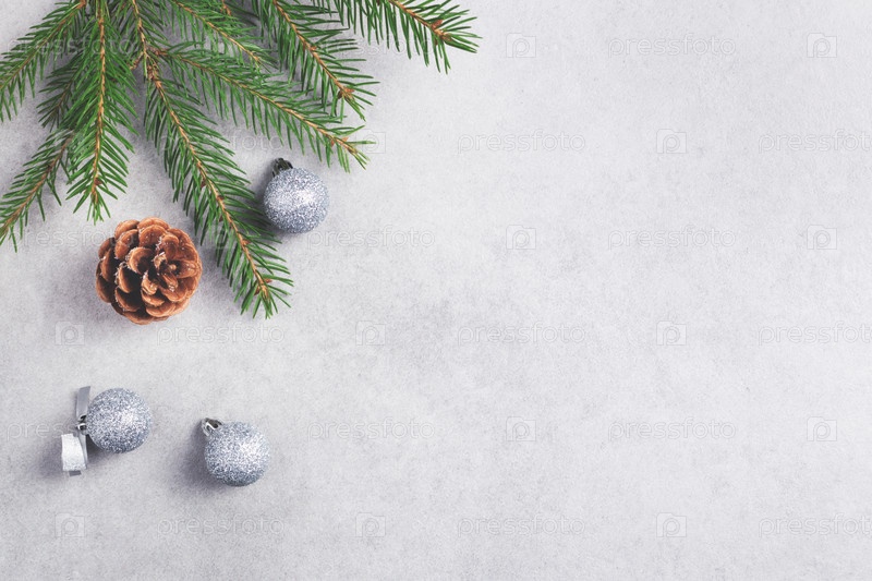 Рождественские украшения на сером фоне с копией пространства. Новогодняя рамка