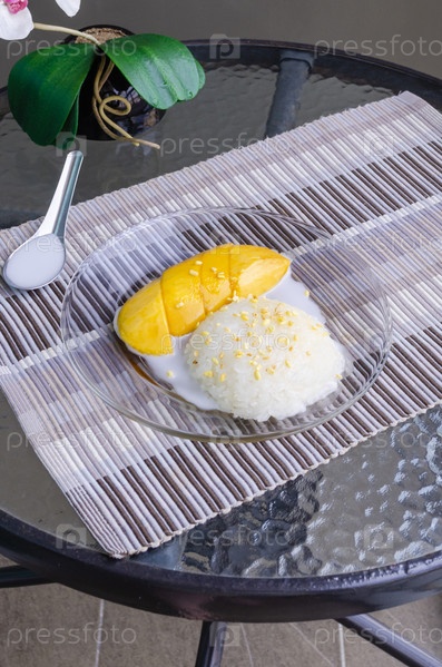 Вкусный традиционный тайский десертный липкий рис с манго и сладким кокосовым молоком на открытом стеклянном столе