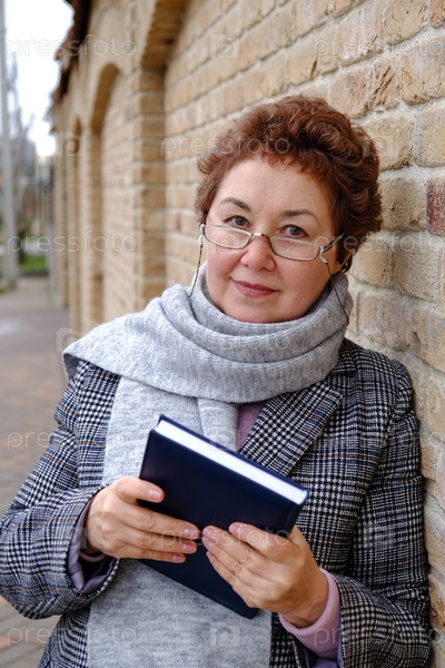 Взрослая женщина пенсионер в очках и с книгой в руках на фоне стены