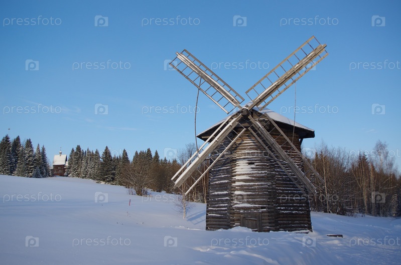 Заснеженная старая деревянная ветряная мельница на фоне леса и голубого неба, снятая сзади