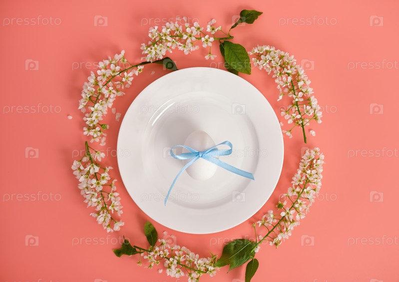 Пасхальная композиция. Пасхальные яйца на белой тарелке, вишневые ветки в форме круга. Розовый фон, пространство для копирования. Вид сверху