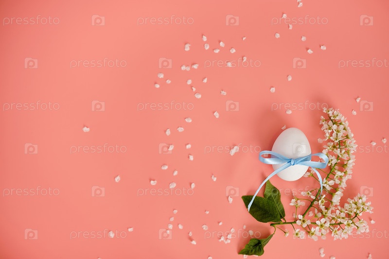 Белое пасхальное яйцо с голубой лентой, вишневыми ветвями, цветами, лепестками на пастельно-розовом фоне. Пасхальная композиция, пространство для копирования, вид сверху