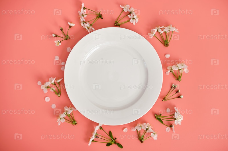 Белые цветы, вишни и пасхальные яйца с голубыми полосками на розовом фоне. Пасхальный фон, пространство для копирования. Флэтлей