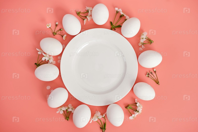 Композиция с пустой тарелкой, пасхальными яйцами и красивыми цветами на розовом фоне, крупным планом. Место для копирования. Вид сверху
