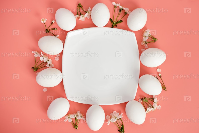 Композиция с пустой тарелкой, пасхальными яйцами и красивыми цветами на розовом фоне, крупным планом. Место для копирования. Вид сверху