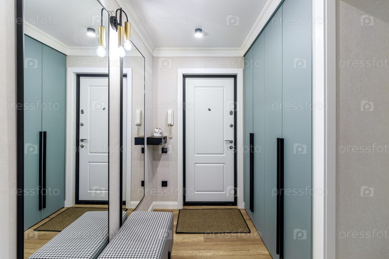 Белая входная дверь в современной отремонтированной прихожей с большими зеркалами и шкафом