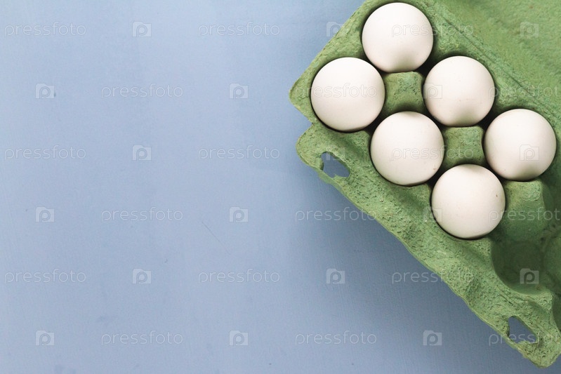 Группа белых куриных яиц на голубом фоне, пустое место для текста