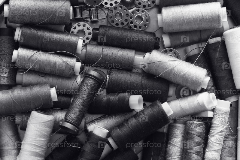 Катушка ниток в черно-белом режиме. медленная мода и концепция домашнего шитья