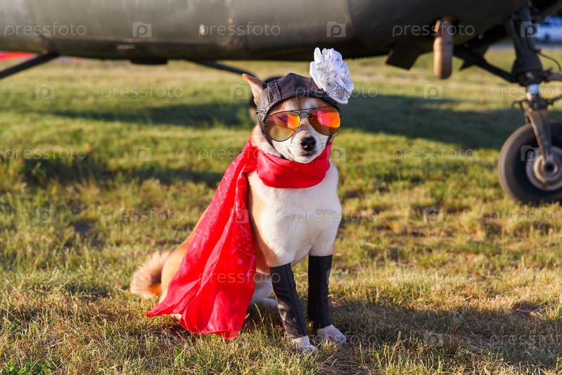 Забавное фото собаки акита-ину в костюме пилота в аэропорту