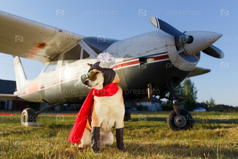Забавное фото собаки шиба-ину в костюме пилота в аэропорту