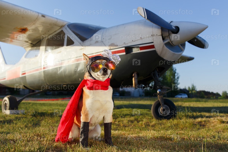 Забавное фото собаки шиба-ину в костюме пилота в аэропорту