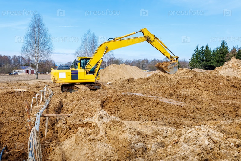 Экскаватор копает траншеи на строительной площадке. Траншея для укладки наружных канализационных труб. Канализационная система многоэтажного дома. Рытье котлованного фундамента