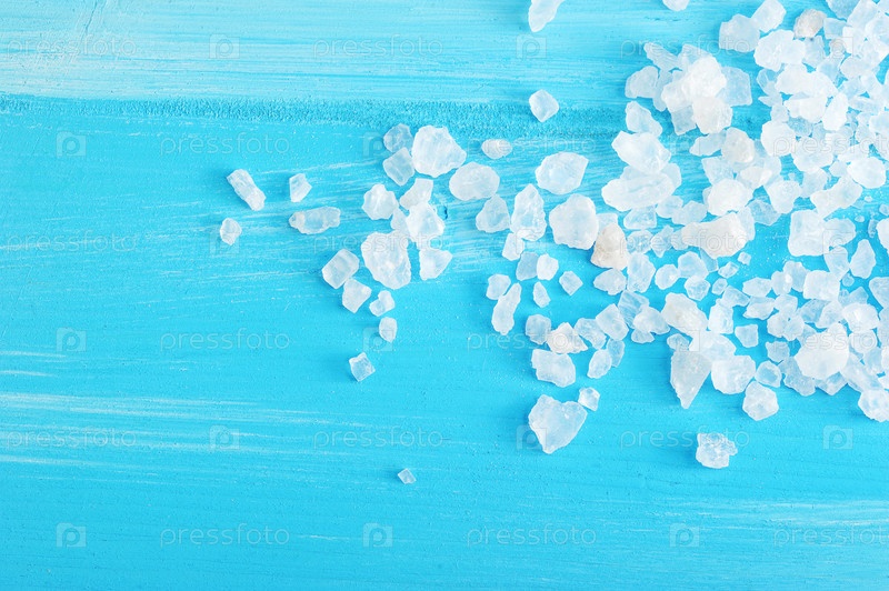 Большие кристаллы каменной соли на синем деревянном фоне