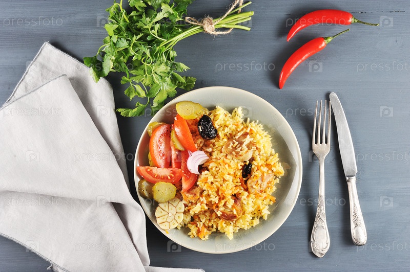 Восточное блюдо - плов с черносливом, салат с луком и соленьями, петрушкой