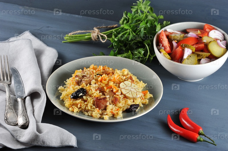 Восточное блюдо - плов с черносливом, салат с луком и соленьями, петрушкой