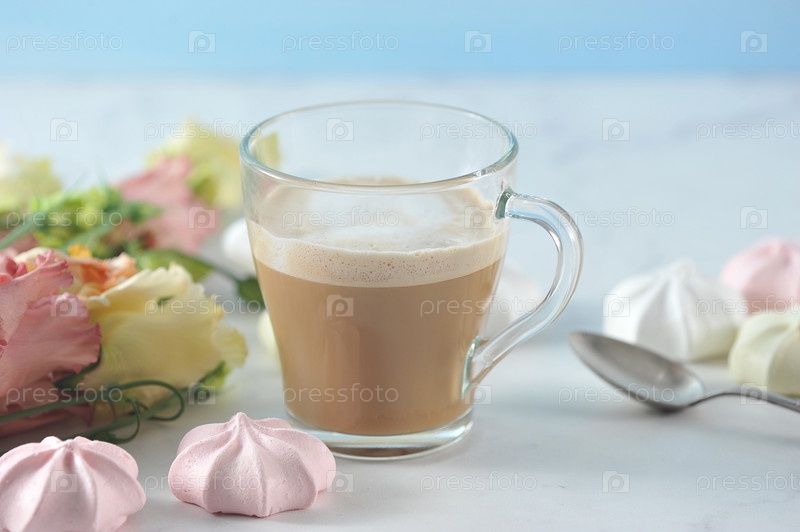 Капучино в прозрачной кружке с цветами и зефиром