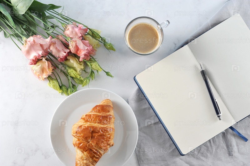 Раскройте тетрадь с цветками и черным кофе и круассаном