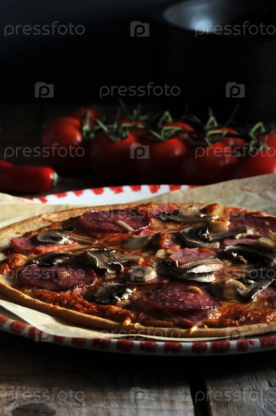 Домашняя сырная пицца с салями и шампиньонами