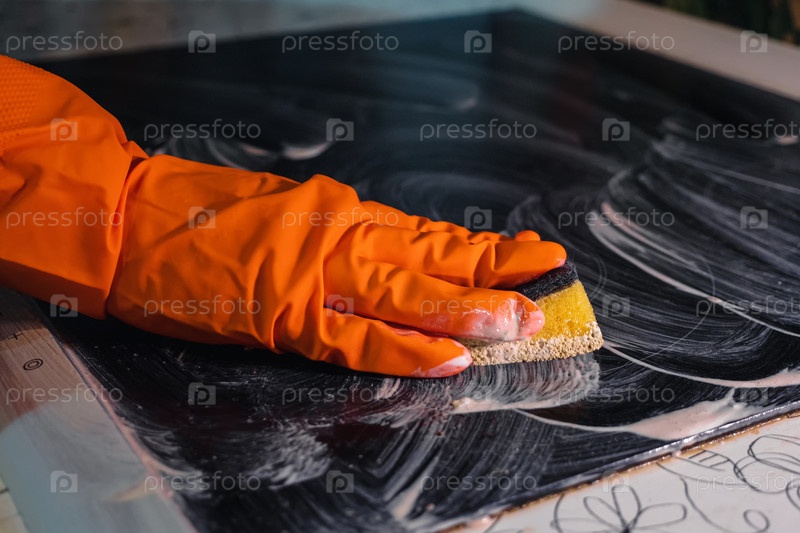 Оранжевая перчатка с желтой губкой моет кухонную плиту, смоченную чистящим средством. Концепция уборки дома