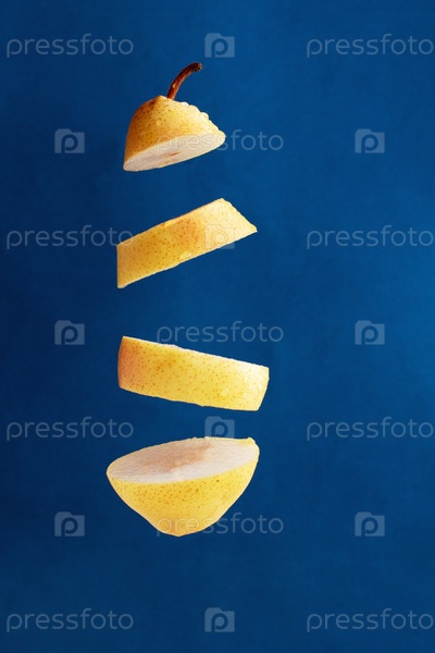 Плавающие кусочки свежего лимона на синем фоне, креативная картинка