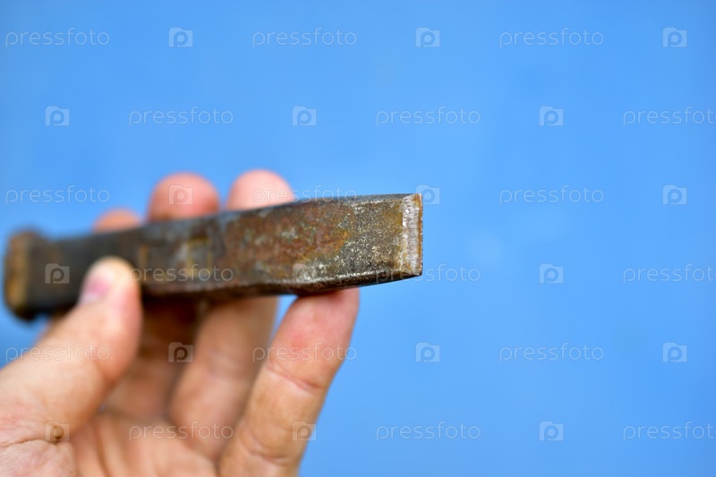 Стальное долото в руках мастера на синем фоне