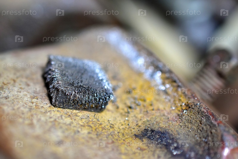 Металлический магнит в железной крошке в руках