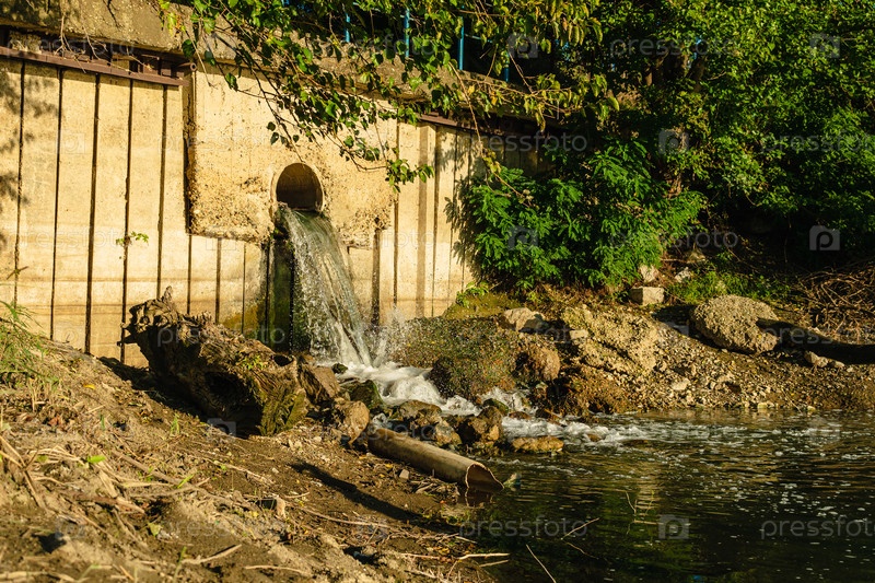 Грязные сточные воды льются в реку через трубу в бетонной стене. На поверхности воды белая пена, на заднем плане деревья с зеленой листвой. Понятие экологии