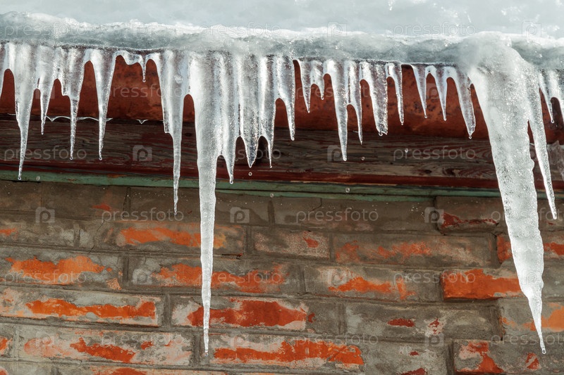 Сосульки на крыше дома у стены из красного кирпича. Капли воды слетают с сосулек. Зимний солнечный день в сельской местности
