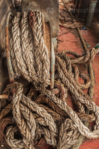 Грязный корабельный канат размотался среди обломков на борту потерпевшего кораблекрушение. Вид с корабля