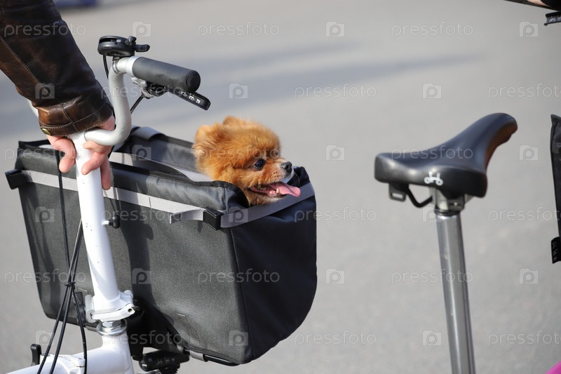 Маленькая милая собачка на прогулке в парке гуляет в велосипедной переноске