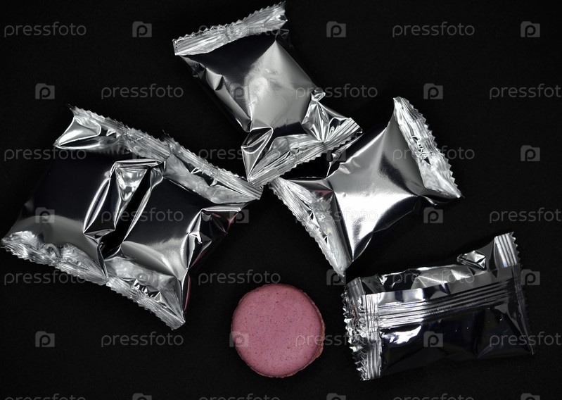 Миндальное печенье в блестящей обертке. Красочные вкусные миндальное печенье на черном фоне. Блестящая обертка для печенья