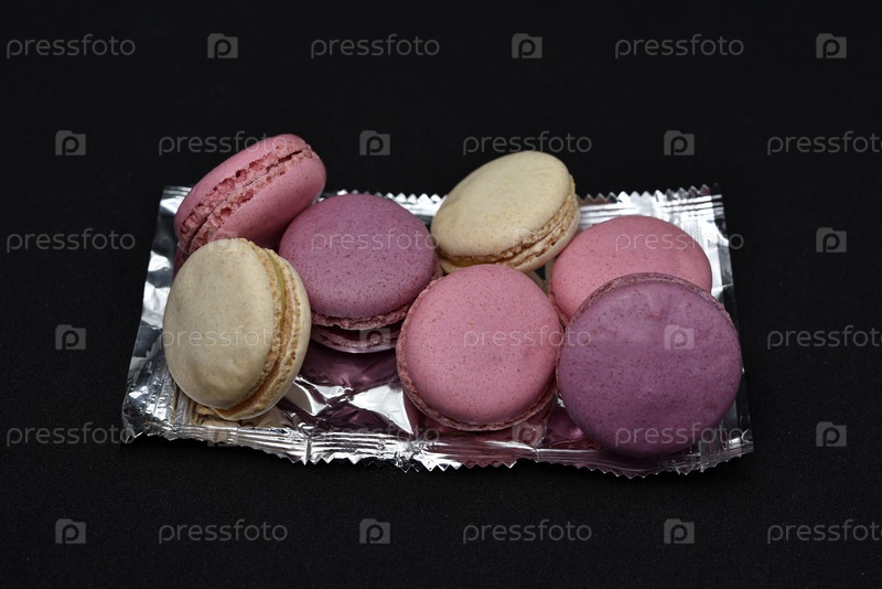Миндальное печенье в блестящей обертке. Красочные вкусные миндальное печенье на черном фоне. Блестящая обертка для печенья