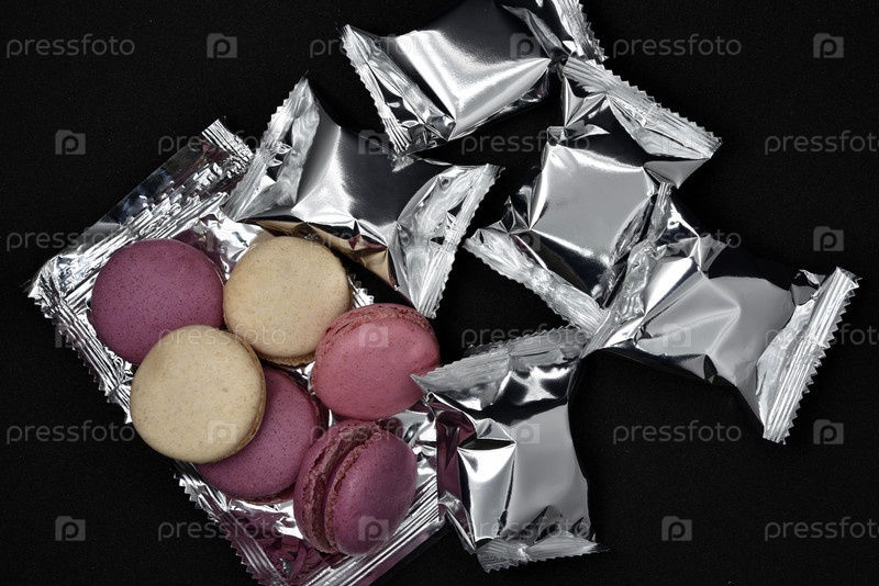 Миндальное печенье в блестящей обертке. Красочные вкусные миндальное печенье на черном фоне. Блестящая обертка для печенья