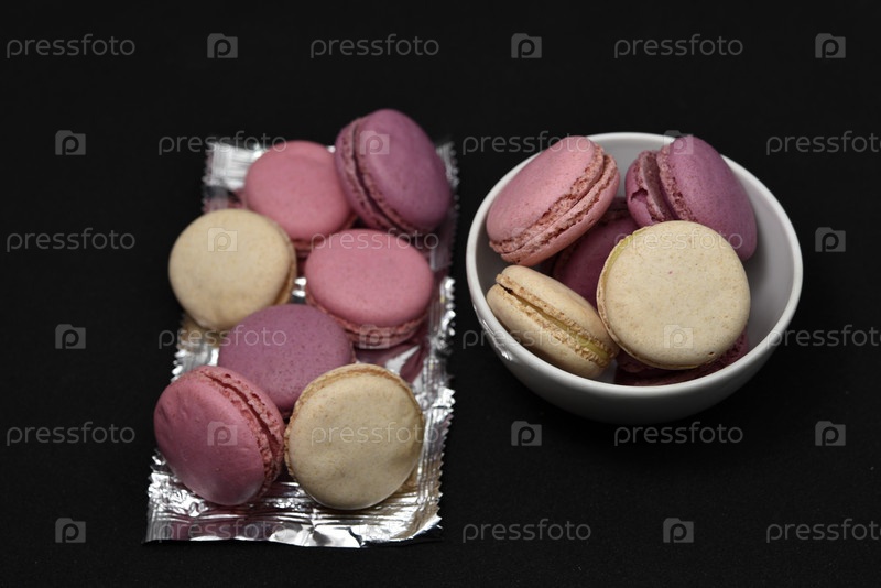 Миндальное печенье в блестящей обертке. Красочные вкусные миндальное печенье на черном фоне. Блестящая обертка для печенья