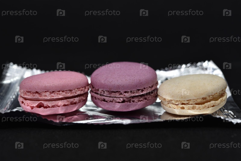 Миндальное печенье в блестящей обертке. Красочные вкусные миндальное печенье на черном фоне. Блестящая обертка для печенья