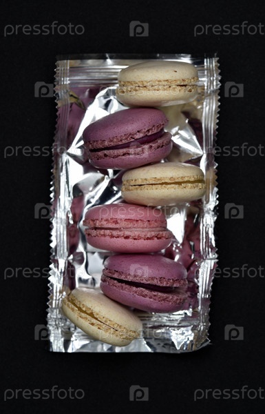 Миндальное печенье в блестящей обертке. Красочные вкусные миндальное печенье на черном фоне. Блестящая обертка для печенья