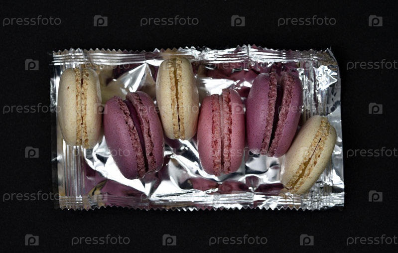 Миндальное печенье в блестящей обертке. Красочные вкусные миндальное печенье на черном фоне. Блестящая обертка для печенья