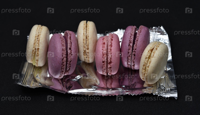 Миндальное печенье в блестящей обертке. Красочные вкусные миндальное печенье на черном фоне. Блестящая обертка для печенья