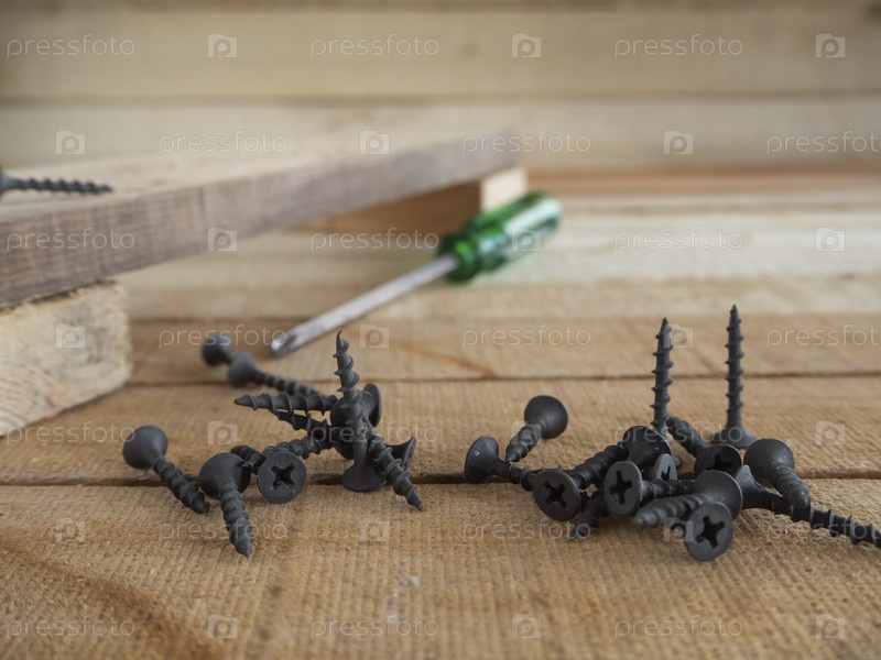 Саморезы на деревянной поверхности и деревянном фоне. Выборочный фокус. Строительные и ремонтные работы. Черные винты
