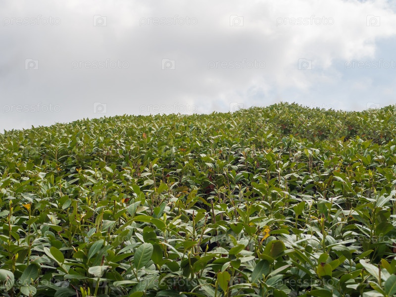 Крутой холм, покрытый зелеными кустами с сочными листьями, уходит в небо