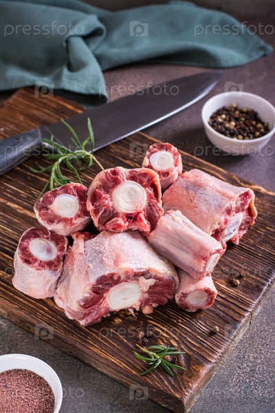 Кусочки сырого бычьего хвоста и специи для приготовления пищи на деревянной доске на вертикальном столе