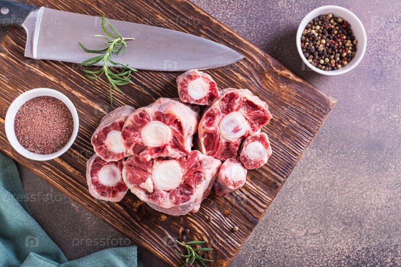 Сырой нарезанный бычий хвост, специи и розмарин на деревянной доске, вид сверху