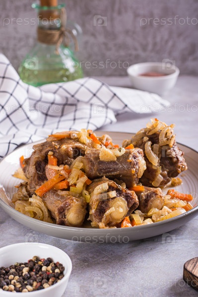 Тушеный бычий хвост с морковью и луком на тарелке на вертикальном столе