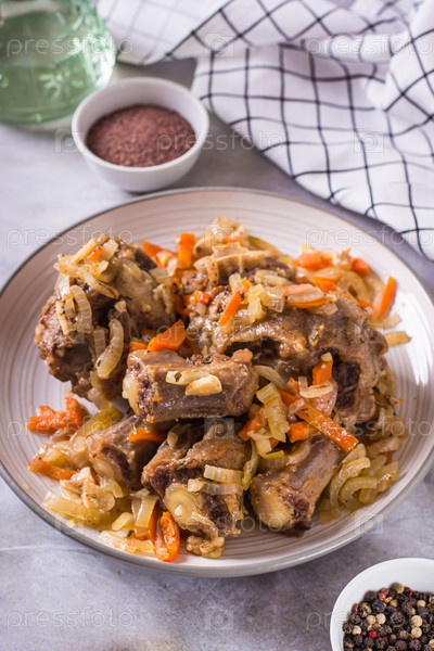 Тушеный говяжий хвост с вином и овощами на тарелке на вертикальном столе