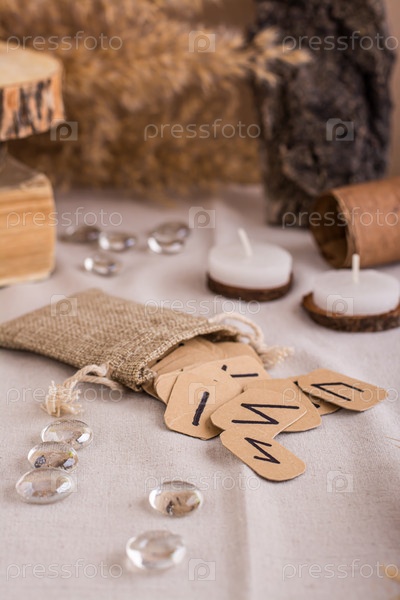 Картонные скандинавские руны ручной работы в сумке на столе для гаданий по вертикали