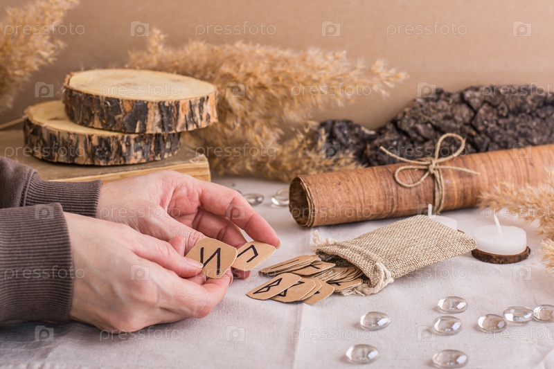 Женские руки перебирают руны скандинавского гадания на столе
