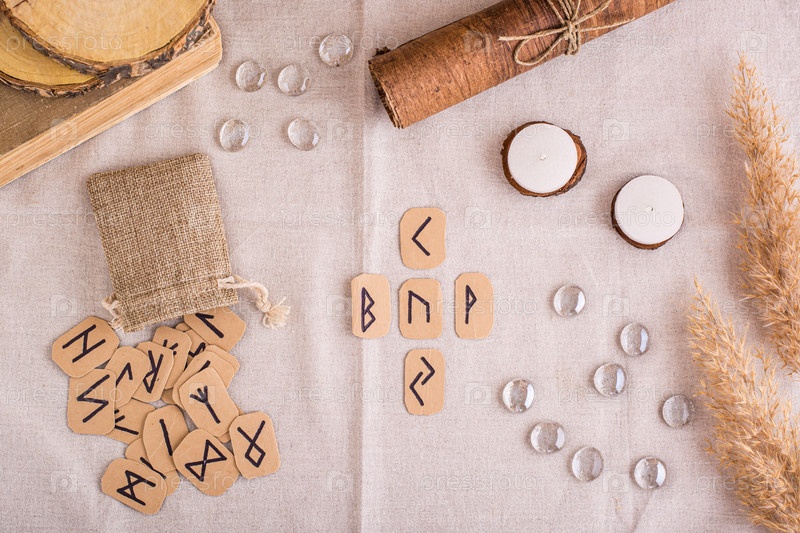 Гадание крестом на самодельных скандинавских рунах на столешнице вид