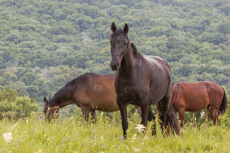 Три лошади пасутся на пастбище в горах среди зеленой травы. Понятие скотоводства