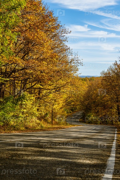 Асфальтовая дорога проходит через желто-зеленый лес. На заднем фоне голубое небо. Тени от деревьев на дороге. Концепция путешествия