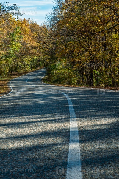 Белая полоса разметки на асфальтированной дороге с поворотами. По обочинам дороги желто-зеленый осенний лес. На заднем плане голубое небо с облаками. Нижний ракурс